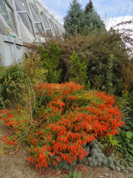 What an amazing autumn! We almost always have had a dusting of snow by now, or light frost. But this fiery summer blazes on, especially in the many spectacular scarlet, crimson and fiery flowers around the Gardens. You can undoubtedly tell where I took the first picture (in front of the conservatory). I know, I know, many botanists have flocked to lump Zauschneria into Epilobium... and they undoubtedly have ample justification. But I figure, if hummingbirds can tell the difference, so can I! This giant burning bush from Arizona is one of the toughest xeriscape perennials and has been sold in Denver for decades, but you rarely see it. Of course, many years it gets frosted just before it reaches maximum conflagration, but not this year! Better mosey on down and check it out (bring your sunglasses to protect your eyes!).
