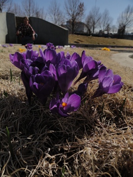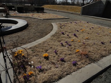 Nearly ten years ago the seeds for a remarkable garden were planted when Wellington and Wilma Webb visited Versailles. They wanted a dramatic garden near the entrance of the city instead of the industrial wasteland of the Platte Valley. Centennial Park [located at the northeast side of Elitch Gardens, just off 15th and Little Raven] was created as a fulfillment of the Webb's dream, and I was one of the team from Denver Botanic Gardens who helped design and create this garden. The clock fast forwards a decade: Denver Botanic Gardens is no longer involved with the maintenance or planning here. But I believe Centennial has more than achieved its dream. There are incredible hedges of native shrubs that only need to be trimmed once a year since they are kept dry and do not flush repeatedly as privet would do. There are masses of perennials in season, and some novel plantings unlike anything else in the City.  I am especially amazed to see how beautiful the buffalo grass (Buchloe dactyloides) has performed.  It is trim and neat year 'round, and never more beautiful than right now filled with these robust spring crocuses. There are autumn crocuses in it as well in September and October. I can't tell you how good these looked! Imagine in a few years when they seed around!