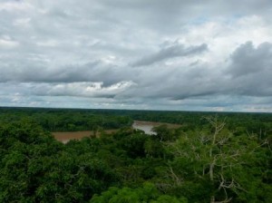 120 feet in the air, you get a spectacular view and a new appreciation for the vastness of the Amazon basin. As far as the eye can see in any direction, there are trees, water and more trees. The snow-capped Andes Mountains, the source of all the river water, can be seen far in the distance. We spotted several bird species from the tower and while on our hike, we saw incredible plant and insect diversity and heard the sounds of all the other wildlife (especially monkeys) that were more reluctant to be seen. We have an early wake up call in the morning so after another tasty dinner, we turned in early. With limited electricity there isn’t much need to stay up late and besides, hiking in the mud can be very tiring. This morning we head to an oxbow lake, a small swampy lake created when a hair-pin turn in the river becomes cut off from the main current. It was raining most of the morning, but that didn’t stop us from seeing caiman and several species of birds and the almost comical looking long-nosed bat. We also got to go fishing for piranha – catch and release of course.