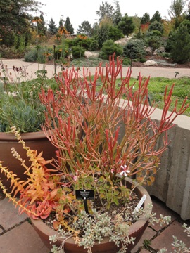 All summer long the containers throughout the gardens did their duty. I particularly admire the wonderful succulent containers in the South African plaza: but a single flower of Pelargonium just off center, but such richness of color and texture in stems and chubby leaves. No doubt these are tucked away safely in a glasshouse, waiting to come out again next spring. But it takes the intense summer sun and brash winds to bring out these colors in the out of doors. I love how in this picture we have the intricate vignette of container in the foreground, but a vista of intriguing mystery beyond. This interplay of vista and vignette is really the secret to the magic of Denver Botanic Gardens! In my opinion, nobody does it better than our talented horticulturists! We can all get all excited about winter bark, branches and berries, but it's fun to take a longing, lingering look back at a really awesome growing season! And now let's dream about the one to come!
