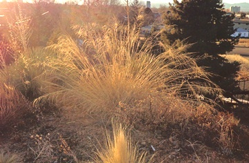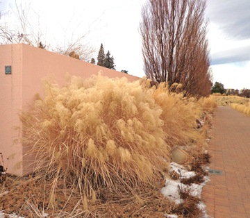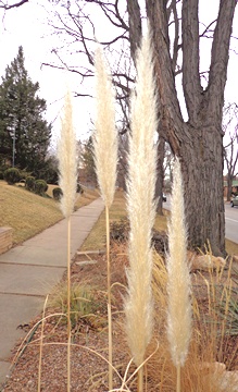 Yes, Virginia...pampas grass (Cortaderia selloana) does indeed grow in Denver...although not in great numbers. Observant visitors will have noticed them dotted here and there at the York Street gardens, and I have seen another half dozen driving around Denver. The one above is right next to University Avenue, and constitutes a minor traffic hazard as grass-afficionados notice it and swerve! I suspect the owners purchased it via mail order, since these are rarely sold locally ("pampas grass is not hardy" according to most pretty well-informed nursery folk. And I agree, most are not. Only the dwarf, high elevation forms are apt to be hardy here, and these are hard to find). Most Coloradoans probably don't know that pampas grass is a pestiferous weed in California--but then one man's weed is another man's treasure. I doubt that this will ever pose much of a threat in our climate. I share this picture to show that much of the creative work of plant experimentation is undertaken by home gardeners. We at the Gardens sometimes have to run to keep up! Here you can see from closer up the silky, silvery color that true pampas grass has seemed to perfect. If you have driven parts of Texas you are sure to have admired pampas grass--a popular landscape plant in that state. I used to drive down at Thanksgiving each year, and the clumps of pampas here and there along the way were like mile posts, or sentinels that cheered the trip. Their fluffy seedheads are amazing when they puff up. Alas! A well established clump is so massive that cutting it back each year is a chore. This is one of the hazards of growing large grasses anywhere. Confusingly called "hardy pampas grass" (a paradox if you think about it...), this is the most commonly planted giant grass around Denver. I am sure half the people who grow it think it is pampas grass, and if you look up and compare, you will see there is a family resemblance. But while the TRUE pampas grass comes from South America as the name suggests, Ravenna Grass is from the Mediterranean. This still grows abundantly in the coastal marshes near Ravenna I've been told. This is by far the most vigorous and giant of commonly grown grasses, and a large clump will often produce vigorous seedlings nearby that should be dug while young. A large clump needs a front end loader to move or remove...be warned! Until recently it was classed as an Erianthus, but has been put in the same genus as sugar cane in the last decade or so (Saccharum). Sugar cane has helped make Brazil energy self reliant. Maybe this vigorous grass has biomass potential? The group that has been exploited most for that in America is another genus altogether, however... There are hundreds of cultivars selected from the various species of Miscanthus--which is also often sold as hardy pampas grass. They are hardy enough but the name is taken, I'm sorry. A great deal of research is being done on these because of their famous C4 metabolism which allows them to accrue enormous biomass in short periods of time. Miscanthus have nevertheless been practically banned in much of the eastern U.S. due to their propensity to produce colossal seed crops. I have yet to see a seedling appear in Denver outside, so I think we can grow these without guilt--except that these are the most water demanding of these larger grasses. Don't try them in your Xeriscape! My current favorite giant grass is native not far from us here in the Rio Grande Valley. Plant Select has chosen to feature this plant in 2006 and I can vouch for its toughness. The plant you see in the picture is in my garden, on very sandy soil where it bakes for months on end and gets precious little water. Even so, it makes a fabulous fountain of golden seedheads that persist through the winter months. Indeed, all of these pictures were taken this morning, January 24. The greatest reason to grow these pampas grasses (and their pretenders too!) is that they provide drama, beauty, movement and interest in the depths of winter for months on end. If you grow them, please resist cutting them back until February so we can enjoy their splendid display! But do cut them back hard so that the new growth will be fresh and green for the coming year!